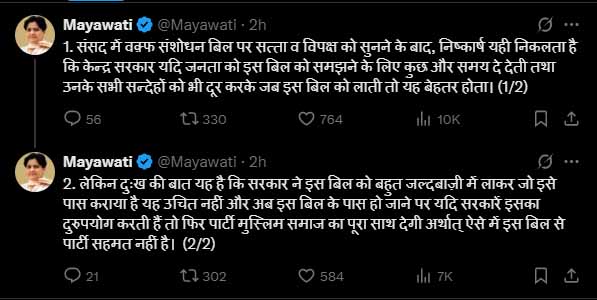 मायावती ने यह भी कहा कि यह दुर्भाग्यपूर्ण है कि सरकार ने इस बिल को बहुत जल्दबाजी में पास करवा लिया, जो सही नहीं है। उन्होंने चेतावनी दी कि अगर सरकार इस बिल का दुरुपयोग करती है, तो उनकी पार्टी मुस्लिम समाज का पूरा समर्थन करेगी, क्योंकि पार्टी इस बिल से सहमत नहीं है।