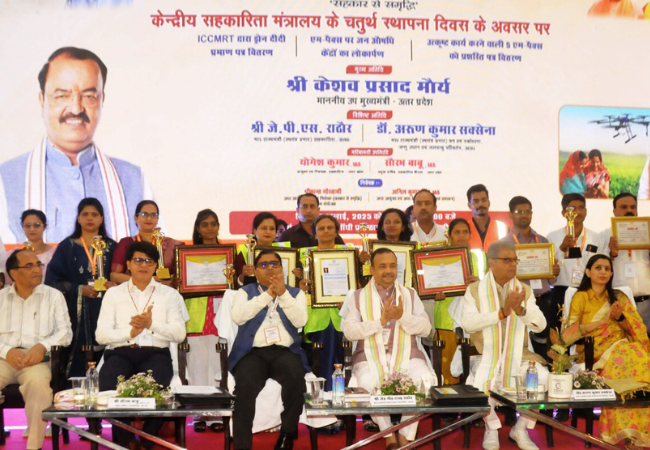 इस अवसर पर 266 ड्रोन दीदियों को DGCA प्रमाणपत्र सौंपे गए , समारोह में सहकारिता क्षेत्र में उत्कृष्ट योगदान हेतु प्रदेश की पांच एम-पैक्स समितियों शाहजहांपुर, कानपुर, इटावा, हापुड़ और रायबरेली को प्रशस्ति पत्र प्रदान किए गए। इन समितियों ने कृषि ऋण, उर्वरक वितरण, मूल्य समर्थन योजना और जन औषधि केन्द्र जैसे कार्यों में उल्लेखनीय भूमिका निभाई है। साथ ही, मेरठ और गौतम बुद्ध नगर के दो सचिवों श्री जयप्रकाश मिश्रा और श्री शिवदत्त शर्मा को उनके द्वारा सहकारी निधि की रक्षा करते समय किए गए साहसिक कार्यों के लिए वीरता सम्मान प्रदान किया गया। दोनों अधिकारियों ने अपने कर्तव्यों का निर्वहन करते हुए लाखों रुपये की निधि को अपराधियों से बचाया और बैंक में जमा कराया।