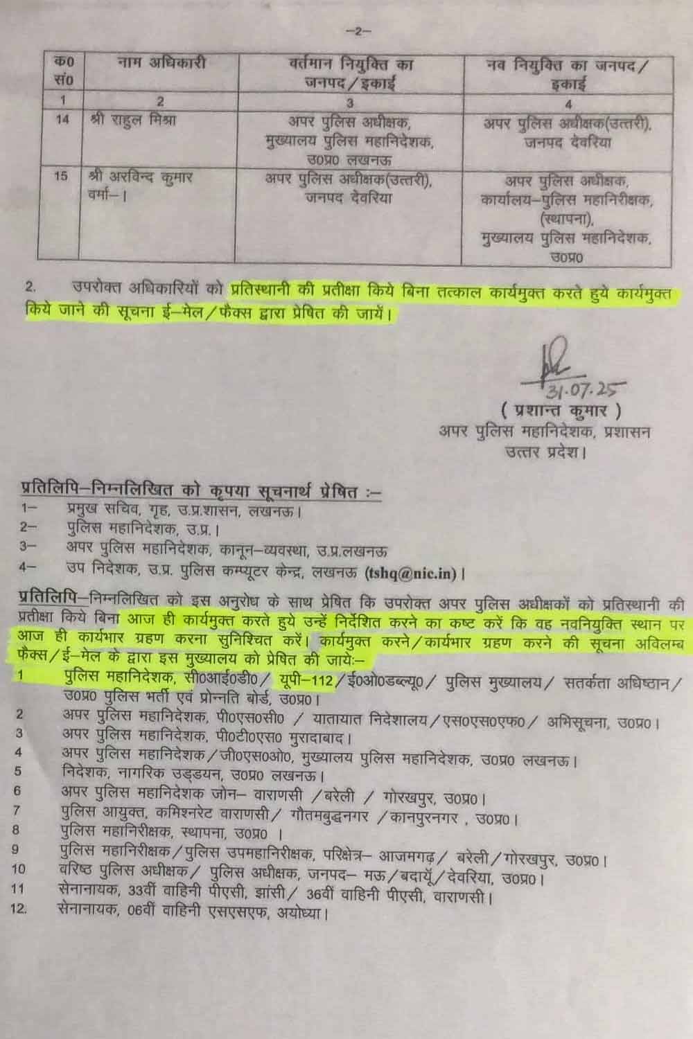 Sandesh Wahak Digital Desk: उत्तर प्रदेश पुलिस प्रशासन ने बृहस्पतिवार को प्रांतीय पुलिस सेवा (PPS) के 15 अपर पुलिस अधीक्षकों (APS) के तबादले का आदेश जारी किया। इस बड़े फेरबदल में कई प्रमुख जिलों और विभागों में नए अधिकारियों की नियुक्ति की गई है।