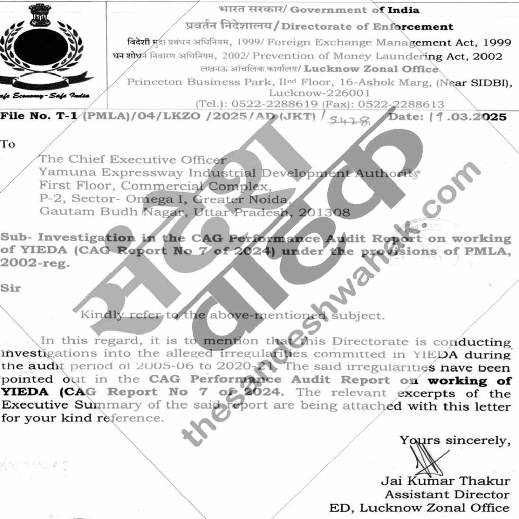 ‘संदेश वाहक’ के पास ईडी के लखनऊ जोनल दफ्तर में तैनात असिस्टेंट डायरेक्टर जय कुमार ठाकुर का 19 मार्च को यीडा के सीईओ डॉ अरुण वीर सिंह को भेजा वो पत्र है। जिसमें कहा गया है कि 2005-06 से 2020-21 के ऑडिट पीरियड के दौरान सामने आयीं अनियमितताओं पर प्रवर्तन निदेशालय स्तर से जांच शुरू की गयी है। ईडी ने यीडा से सरकार द्वारा कराई गयी जांच व कमेटी के गठन का स्टेट्स, रिपोर्ट और शिकायतों की सत्यापित प्रति मांगी है। वहीं जांचों में दोषी अफसरों का ब्यौरा भी तलब किया है। उक्त जानकारियां पीएमएलए ऐक्ट के सेक्शन 54 के तहत ईडी ने मांगी हैं। दिल्ली मुख्यालय से हरी झंडी मिलते ही ईडी के लखनऊ जोनल दफ्तर के जॉइंट डायरेक्टर राजकुमार ने जांच शुरू करा दी है।
