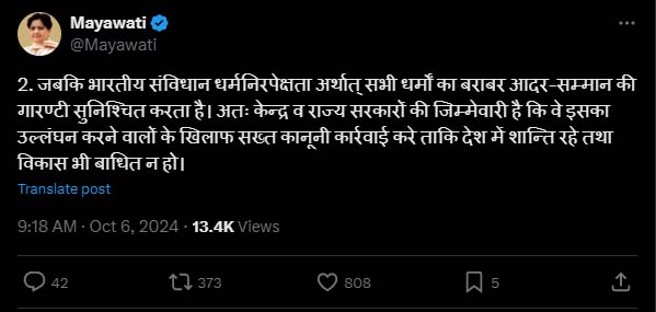 मायावती ने सोशल मीडिया मंच ‘एक्स’ पर कहा उत्तर प्रदेश के गाजियाबाद में डासना देवी मंदिर के महंत ने इस्लाम के खिलाफ फिर नफरती बयानबाजी की जिससे उस पूरे इलाके में तथा देश के कई हिस्सों में अशांति एवं तनाव की स्थिति पैदा हो गई है। पुलिस ने प्रदर्शनकारियों के खिलाफ तो कार्रवाई की लेकिन मूल दोषी भयमुक्त है।