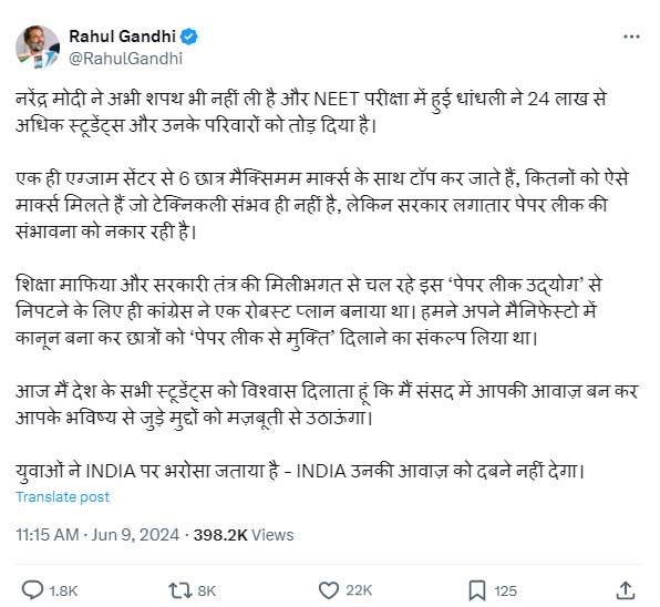 राहुल गांधी ने एक्स पर लिखा कि ‘नरेंद्र मोदी ने अभी शपथ भी नहीं ली है और NEET परीक्षा में हुई धांधली ने 24 लाख से अधिक स्टूडेंट्स और उनके परिवारों को तोड़ दिया है। एक ही एग्जाम सेंटर से 6 छात्र मैक्सिमम मार्क्स के साथ टॉप कर जाते हैं, कितनों को ऐसे मार्क्स मिलते हैं जो टेक्निकली संभव ही नहीं है, लेकिन सरकार लगातार पेपर लीक की संभावना को नकार रही है’।