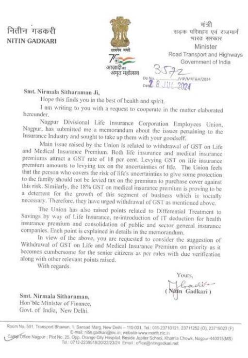 उन्होंने यह भी कहा कि लाइफ एडं मेडिकल इंश्योरेंस प्रीमियम पर GST का भुगतान करना सीनियर नागरिकों के लिए चुनौती जैसा है। अपने पत्र में गडकरी ने कहा कि आपसे गुजारिश है कि लाइफ एडं मेडिकल इंश्योरेंस प्रीमियम पर GST वापस लेने के सुझाव पर प्राथमिकता के आधार पर विचार करें। क्योंकि यह सीनियर नागरिकों के लिए नियमों के मुताबिक बोझिल हो जाता है। साथ ही अन्य प्रासंगिक बिंदुओं पर उचित सत्यापन भी किया जाना चाहिए।