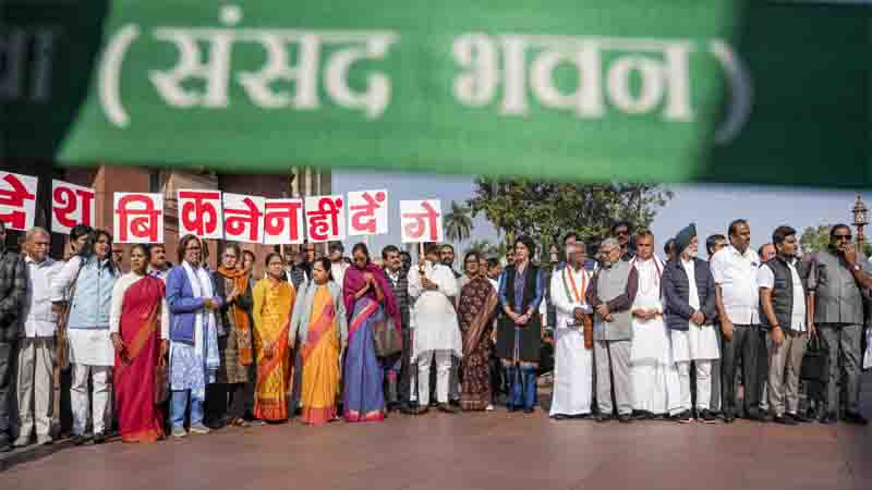 कांग्रेस, राष्ट्रीय जनता दल (राजद) और कुछ अन्य दलों के सांसद संसद भवन के ‘मकर द्वार’ के निकट एकत्र हुए और सरकार के खिलाफ नारेबाजी की। उन्होंने ‘वी वांट जेपीसी’ के नारे लगाए। उन्होंने मकर द्वार से संसद भवन में प्रवेश करने वाले भाजपा और सहयोगी दलों के सांसदों को तिरंगा और गुलाब का फूल भेंट किया तथा कहा कि ‘देश मत बिकने दें।’’