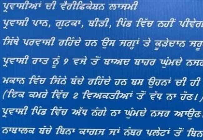 गांव के गुरुद्वारे के बाहर, खासकर उत्तर प्रदेश और बिहार से आने वाले प्रवासी श्रमिकों ने सड़कों पर थूकना उनके गुरू जी का अपमान है। यही वजह है कि यूपी-बिहार के मजदूरों के लिए कुछ दिशा निर्देश जारी किए गए हैं। इन प्रवासियों को इन नियमों को मानना होगा अगर वे यहां रहना चाहते हैं।