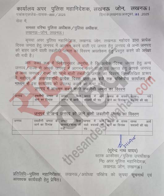 दरअसल 31 अक्टूबर 2025 को लखनऊ जोन के तहत आने वाले जिलों के पुलिस कप्तानों (एसएसपी/एसपी) के लिए एडीजी सुजीत पांडेय की तरफ से उनके स्टाफ अफसर सुरेंद्र नाथ यादव ने पत्र के रूप में एक आदेश जारी किया है। जिसकी प्रतिलिपि आईजी लखनऊ/अयोध्या जोन को भी भेजी गयी है। पत्र के मुताबिक एडीजी ने प्रत्येक दिन सबंधित जिलों में आने वाली और यहां से जाने वाली तब्लीगी जमात का पूरा ब्योरा एक निश्चित फॉर्मैट पर मांगा है।