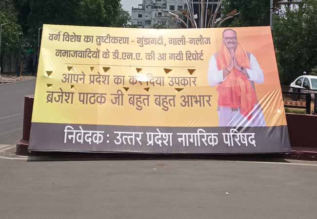 होर्डिंग में बड़े अक्षरों में लिखा गया “वर्ग विशेष का तुष्टिकरण, गुंडागर्दी, गाली-गलौज… नामजवादियों के डीएनए की आ गई रिपोर्ट!” इसके नीचे ब्रजेश पाठक की तस्वीर के साथ संदेश था ‘आपने प्रदेश का कर दिया उपकार, ब्रजेश पाठक जी का बहुत-बहुत आभार।’