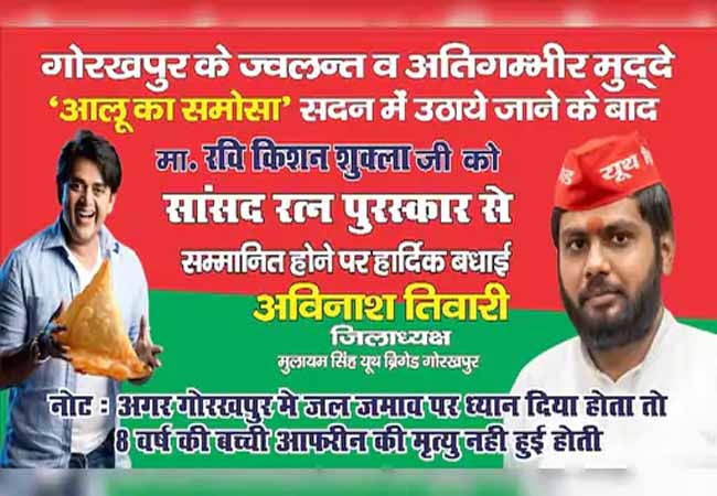 सपा नेता अविनाश तिवारी द्वारा लगवाए गए इस पोस्टर में रवि किशन की एक फोटो है, जिसमें वह हाथ में समोसा लिए हुए हैं। पोस्टर पर तंज कसते हुए लिखा है “गोरखपुर के ज्वलंत अति गंभीर मुद्दा आलू का समोसा सदन में उठाए जाने के बाद रवि किशन को सांसद रत्न पुरस्कार से सम्मानित होने पर हार्दिक बधाई।