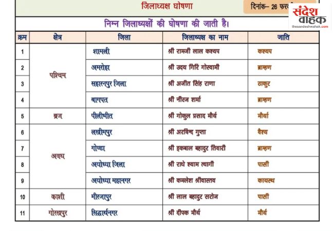 इन नियुक्तियों में जातिगत समीकरणों और क्षेत्रीय पकड़ को प्राथमिकता दी गई है। अयोध्या जैसे महत्वपूर्ण केंद्र में जिला और महानगर के लिए अलग-अलग अनुभवी चेहरों को कमान सौंपी गई है, वहीं पश्चिमी उत्तर प्रदेश के जिलों में भी स्थानीय प्रभाव वाले नेताओं को तरजीह मिली है।