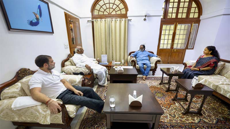 Sandesh Wahak Digital Desk: झारखंड के मुख्यमंत्री हेमंत सोरेन ने मंगलवार को यहां कांग्रेस अध्यक्ष मल्लिकार्जुन खरगे और लोकसभा में विपक्ष के नेता राहुल गांधी से मुलाकात की। इसके बाद राहुल गांधी ने दावा किया कि राज्य के आगामी विधानसभा चुनाव में विपक्षी गठबंधन ‘इंडियन नेशनल डेवलपमेंटल इन्क्लूसिव अलायंस’ भारी बहुमत से जीत हासिल करेगा।