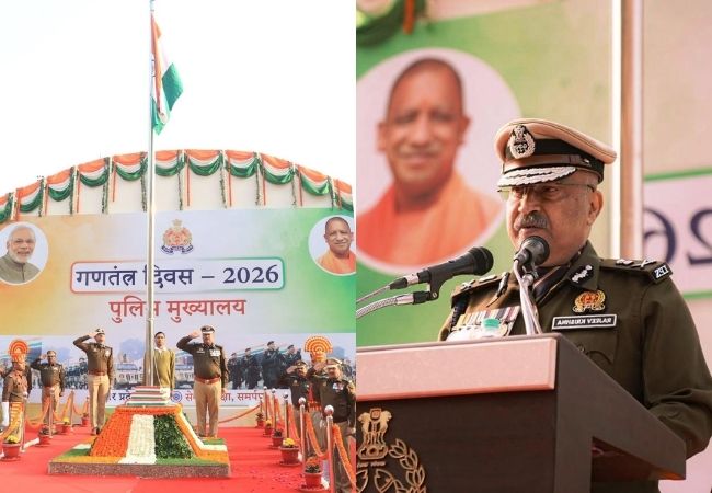 Sandesh Wahak Digital Desk: 77वें गणतंत्र दिवस के गौरवशाली अवसर पर उत्तर प्रदेश के पुलिस महानिदेशक (DGP) राजीव कृष्ण ने लखनऊ स्थित अपने कैंप कार्यालय और पुलिस मुख्यालय (गोमती नगर विस्तार) में ध्वजारोहण किया। तिरंगा फहराने के बाद उन्होंने पुलिस बल को संविधान की शपथ दिलाई और एक ‘सुरक्षित व समृद्ध उत्तर प्रदेश’ के संकल्प को दोहराया।