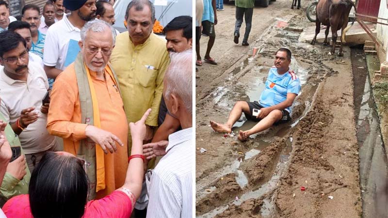 लखनऊ में सुरेश खन्ना का विरोध, सफाई व्यवस्था देखने निकले वित्त मंत्री के सामने कीचड़ में लेट गया युवक