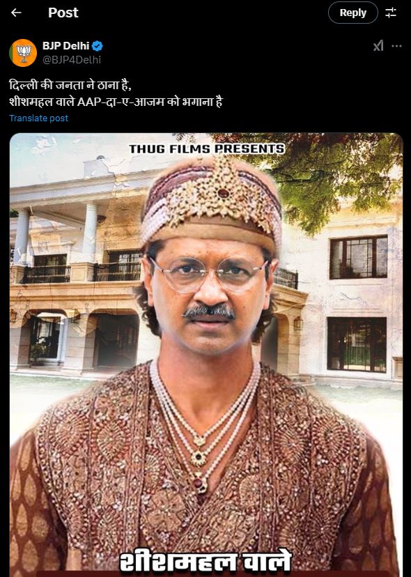 पोस्ट में भाजपा ने अरविंद केजरीवाल को शीशमहल वाला आपदा-ए-आजम बताया है। इसके साथ ही बीजेपी ने एक वीडियो बी जारी किया है। जिसमें अरविंद केजरीवाल को महाठग बताया गया है। तो वहीं पहले चुनाव की घोषणा होने के साथ ही बीजेपी लगातार अरविंद केजरीवाल पर निशाना साध रही है।