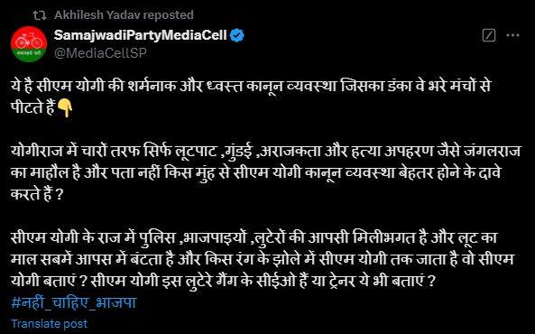 अखिलेश ने सपा के इस ‘पोस्ट’ को अपने आधिकारिक ‘एक्स अकाउंट’ पर साझा किया जिसमें कहा गया है यह है मुख्यमंत्री योगी की शर्मनाक और ध्वस्त कानून-व्यवस्था, जिसका डंका वह भरे मंचों से पीटते हैं।