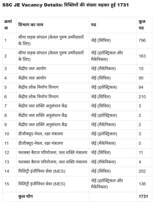 SSC JE 2025: एसएससी जेई भर्ती में रिक्तियां बढ़ीं, अब कुल 1,731 पदों पर होगी नियुक्ति