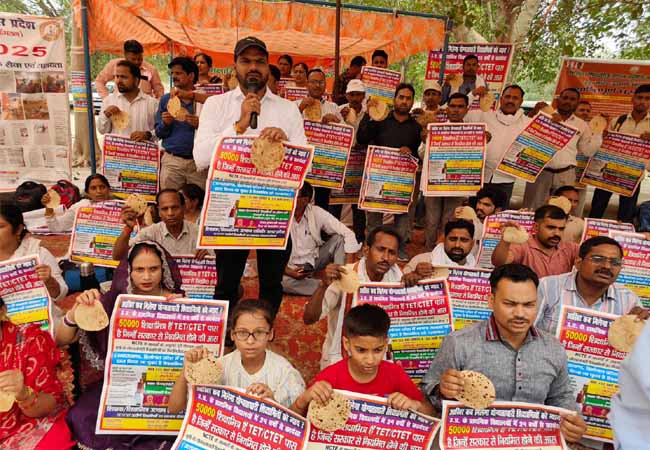 Sandesh Wahak Digital Desk: लखनऊ के इको गार्डन में 2 जून को राज्य भर के शिक्षामित्रों ने ‘दो जून की रोटी’ के लिए प्रदर्शन किया। हाथों में सूखी रोटियां और तख्तियां लिए सैकड़ों TET और CTET पास शिक्षामित्र सड़कों पर उतरे और अपनी आवाज सरकार तक पहुंचाने की कोशिश की।