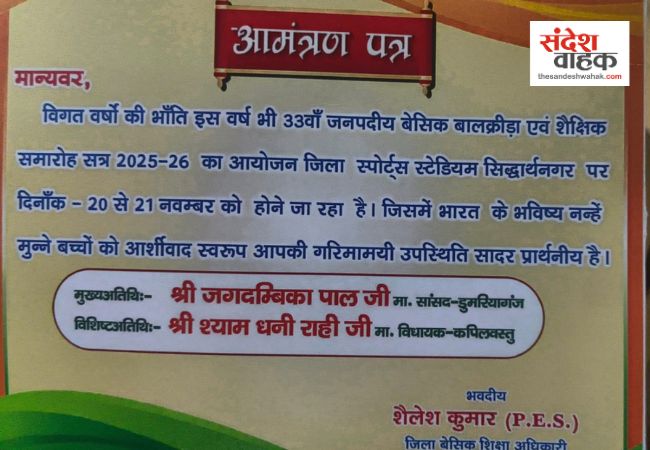 Sandesh Wahak Digital Desk: जनपद सिद्धार्थनगर में सत्र 2025-26 के 33वें जनपदीय बेसिक बालक्रीड़ा एवं शैक्षिक समारोह का दो दिवसीय भव्य आयोजन आज (20 नवंबर) से शुरू हो रहा है।