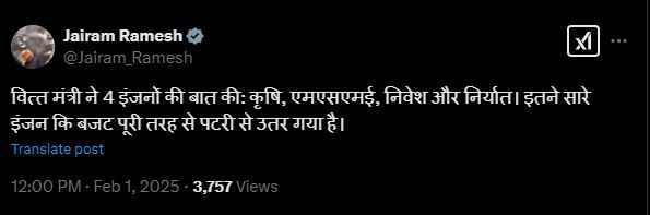 कांग्रेस महासचिव और संचार प्रभारी जयराम रमेश ने ‘एक्स’ पर एक पोस्ट में कहा वित्त मंत्री ने चार इंजनों की बात की- कृषि, एमएसएमई, निवेश और निर्यात। इतने सारे इंजन हैं कि बजट पूरी तरह से पटरी से ही उतर गया है।