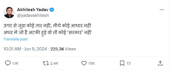 अखिलेश यादव ने ‘एक्स’ पर लिखा कि ‘ऊपर से जुड़ा कोई तार नहीं, नीचे कोई आधार नहीं…अधर में जो है अटकी हुई वो तो कोई ‘सरकार’ नहीं’।