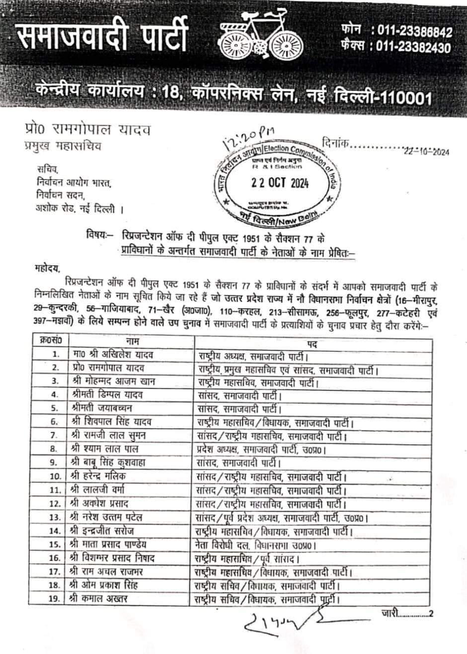 UP By-Election : उत्तर प्रदेश में होने जा रहे उपचुनाव को लेकर समाजवादी पार्टी ने अपने स्टार प्रचारकों की सूची जारी की है। समाजवादी पार्टी अध्यक्ष अखिलेश यादव का नाम सबसे ऊपर है।
