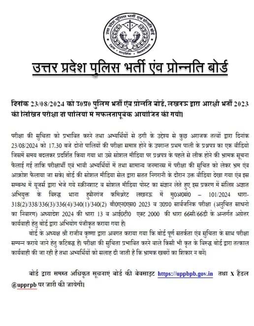 UP Police Constable Exam 2024: उत्तर प्रदेश पुलिस सिपाही भर्ती परीक्षा पेपर लीक की अफवाह फैलाने के मामले में राजधानी लखनऊ के हुसैनगंज थाने में एफआईआर दर्ज की गई है।