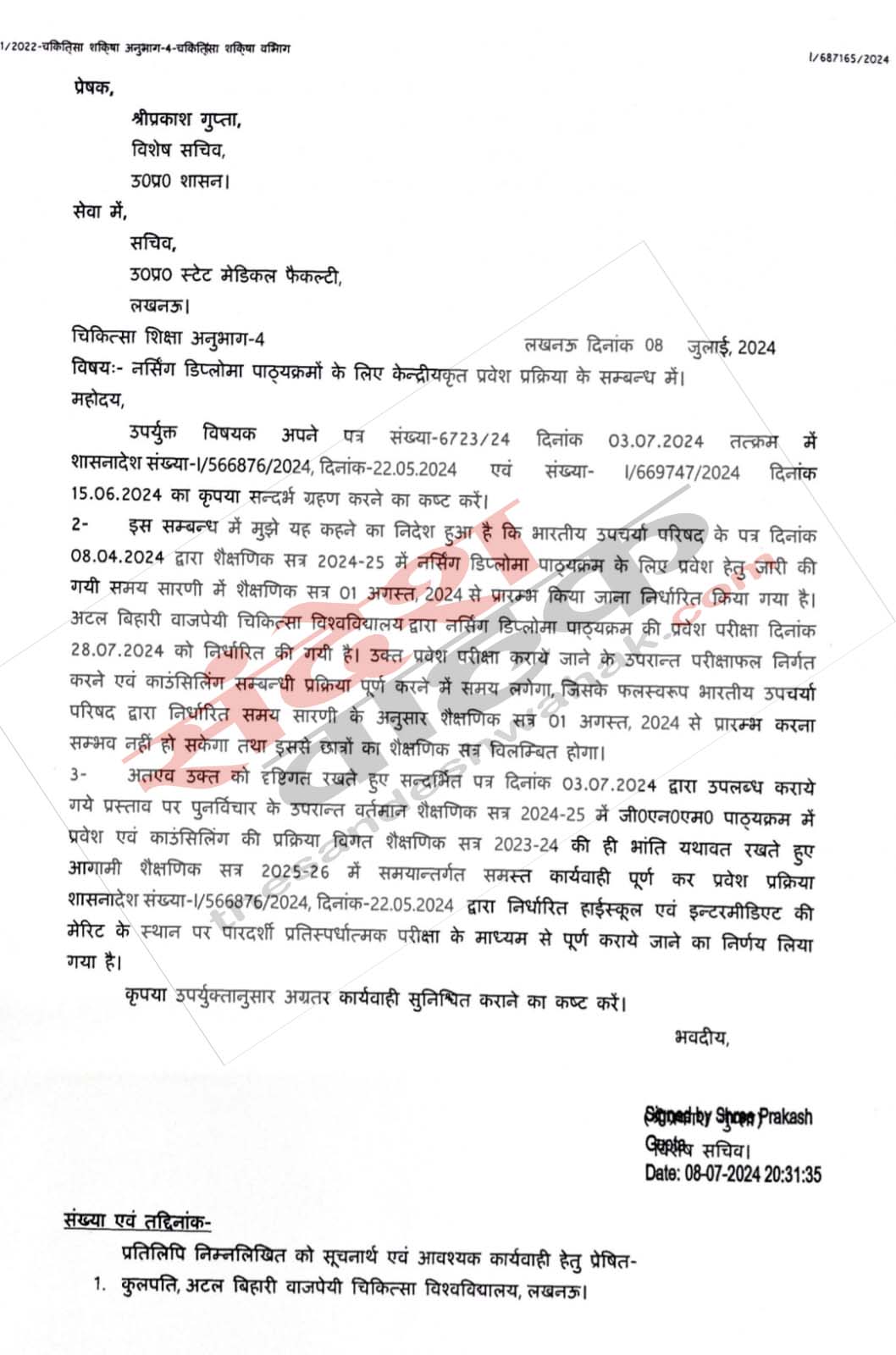 जिसमें इंडियन नर्सिंग काउन्सिल के आठ अप्रैल के पत्र का हवाला देते हुए जीएनएम का शैक्षणिक सत्र एक अगस्त से शुरू होने की बात कही गयी। साथ ही सत्र में विलम्ब का कारण गिनाते हुए प्रवेश परीक्षा अगले सत्र से आयोजित कराने को कहा गया। वहीं मौजूदा सत्र में पुरानी प्रक्रिया (हाईस्कूल और इंटर की मेरिट के आधार पर) के जरिए जीएनएम पाठ्यक्रम में प्रवेश लेने की छूट निजी कॉलेजों को दे डाली।