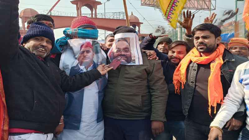 आगरा जिला मुख्यालय पर गुरुवार को अखिल भारत हिन्दू महासभा ने स्वामी प्रसाद और अखिलेश यादव के खिलाफ प्रदर्शन किया। स्वामी प्रसाद मौर्य के पोस्टर को एक शख्स के चेहरे पर लगाकर उसकी जुबान काटने का व दूसरे व्यक्ति के चेहरे पर अखिलेश यादव का पोस्टर लगाकर प्रदर्शन किया। इस दौरान दोनों को गले मिलाया गया।
