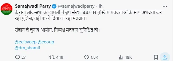 कैराना लोकसभा के गंगोह में बूथ संख्या 7 पर प्रशासन द्वारा लोगों को मतदान करने से रोका जा रहा है। कैराना लोकसभा के शामली में बूथ संख्या 447 पर मुस्लिम मतदताओं के साथ पुलिस अभद्रता कर रही, मुस्लिम वोटरों को मतदान नहीं करने दिया जा रहा।