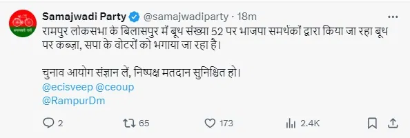 वहीं सपा ने अपने आधिकारिक ट्विटर हैंडल से ट्वीट कर इस बात की जानकारी दी है। दूसरी ओर सपा ने ट्वीट कर कहा कि रामपुर लोकसभा के बिलासपुर में बूथ संख्या 52 पर भाजपा समर्थकों द्वारा बूथ पर कब्जा किया जा रहा है, इसके साथ ही सपा के वोटरों को भगाया जा रहा है।