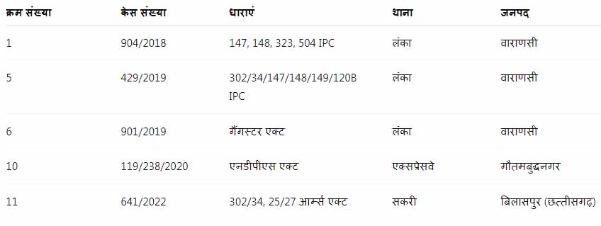 विनय द्विवेदी पर वाराणसी और छत्तीसगढ़ में दर्ज 10 से अधिक गंभीर आपराधिक मुकदमे हैं, जिनमें हत्या, गैंगस्टर एक्ट, आर्म्स एक्ट और एनडीपीएस एक्ट जैसी धाराएं शामिल हैं।
