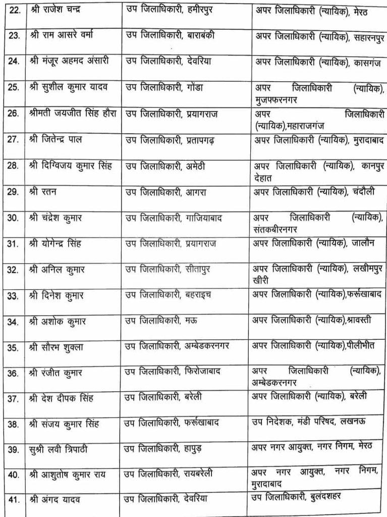 Sandesh Wahak Digital Desk: उत्तर प्रदेश सरकार ने पीसीएस स्तर पर बड़ा प्रशासनिक फेरबदल किया है। बुधवार सुबह जारी आदेश में 41 पीसीएस अधिकारियों के तबादले किए गए हैं, जिनमें से ज्यादातर एसडीएम स्तर के अधिकारी हैं।