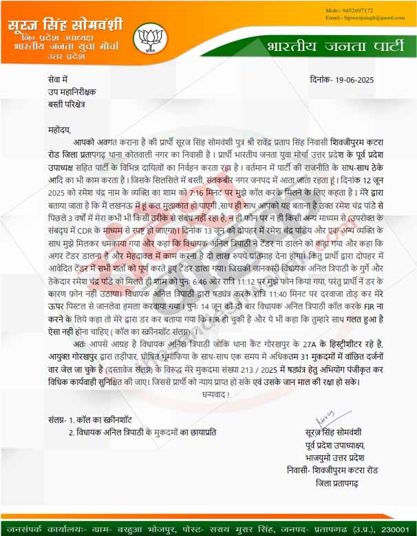 उनके खिलाफ आपराधिक गतिविधियों के कारण उनका पासपोर्ट जब्त और शस्त्र लाइसेंस निरस्त किया जा चुका है। सूरज सोमवंशी ने यह भी बताया कि वर्ष 2024 के लोकसभा चुनाव में त्रिपाठी ने भाजपा प्रत्याशी का खुलकर विरोध किया था, जिसके परिणामस्वरूप उन्हें नेता विधान मंडल की जिम्मेदारी से हटा दिया गया। सोमवंशी ने प्रशासन से मांग की है कि इस प्रकरण की निष्पक्ष और गहन जांच की जाए तथा दोषियों के विरुद्ध कड़ी कानूनी कार्रवाई की जाए।
