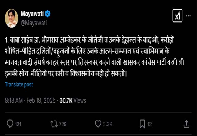 मायावती ने एक्स पर पोस्ट किया कि “बाबा साहेब डा. भीमराव अम्बेडकर के जीतेजी व उनके देहान्त के बाद भी, करोड़ों शोषित-पीड़ित दलितों/बहुजनों के लिए उनके आत्म-सम्मान एवं स्वाभिमान के मानवतावादी संघर्ष का हर स्तर पर तिरस्कार करने वाली खासकर कांग्रेस पार्टी कभी भी इनकी सोच-नीतियों पर खरी व विश्वसनीय नहीं हो सकती।”