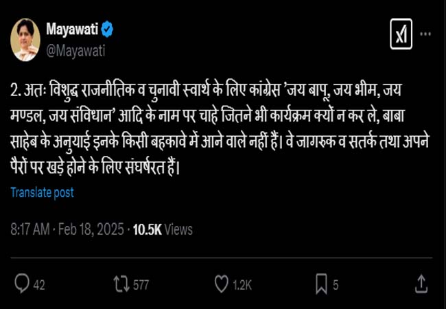 सिलसिलेवार ट्वीट में मायावती ने कहा कि “विशुद्ध राजनीतिक व चुनावी स्वार्थ के लिए कांग्रेस ’जय बापू, जय भीम, जय मण्डल, जय संविधान’ आदि के नाम पर चाहे जितने भी कार्यक्रम क्यों न कर ले, बाबा साहेब के अनुयाई इनके किसी बहकावे में आने वाले नहीं हैं। वे जागरुक व सतर्क तथा अपने पैरों पर खड़े होने के लिए संघर्षरत हैं।”