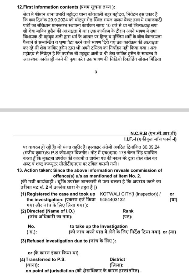 इस सबके बीच महबूब अली के बयान पर एफआईआर दर्ज कर ली गई है। बिजनौर में सपा के कार्यक्रम के दौरान दिए गए बयान पर बिजनौर कोतवाली शहर में एफआईआर दर्ज हुई है। संजीव कुमार की ओर से दर्ज कराई गई एफआईआर में महबूब अली और सपा के जिलाध्यक्ष शेख जाकिर हुसैन के खिलाफ मामला दर्ज किया गया है।