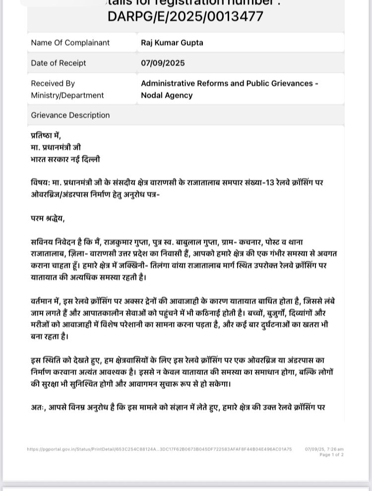 Varanasi News: राजातालाब क्षेत्र के लोगों की लंबे समय से चली आ रही समस्या एक बार फिर सुर्खियों में है। पूर्व क्षेत्र पंचायत सदस्य राजकुमार गुप्ता ने प्रधानमंत्री नरेंद्र मोदी को डिजिटली ज्ञापन भेजकर राजातालाब-जक्खिनी मार्ग स्थित रेलवे फाटक पर ओवरब्रिज या अंडरपास निर्माण की मांग तेज कर दी है।