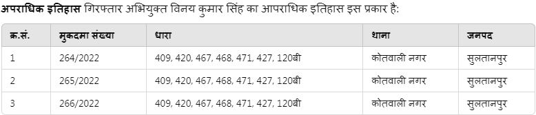 पुलिस अधिकारी ने बताया कि विनय कुमार सिंह पर थाना कोतवाली नगर, जनपद सुलतानपुर में तीन अलग-अलग मुकदमे पंजीकृत हैं। जिनमें मु0अ0सं0 264/2022, 265/2022 एवं 266/2022 शामिल हैं। इन मुकदमों में भारतीय दंड संहिता की धारा 409, 420, 467, 468, 471, 427 व 120बी के तहत आरोप दर्ज हैं।