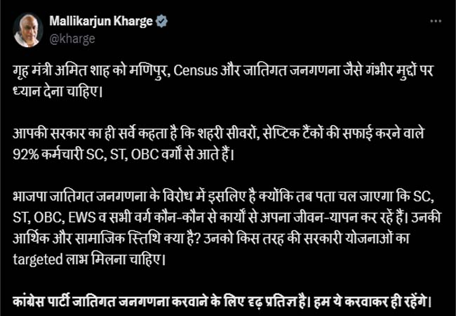 खरगे ने शाह की इस टिप्पणी के बाद ‘एक्स’ पर पोस्ट किया गृह मंत्री अमित शाह को मणिपुर, जनगणना और जातिगत जनगणना जैसे गंभीर मुद्दों पर ध्यान देना चाहिए। आपकी सरकार का ही सर्वे कहता है कि शहरी सीवरों, सेप्टिक टैंकों की सफाई करने वाले 92 प्रतिशत कर्मचारी अनुसूचित जाति, अनुसूचित जनजाति, अन्य पिछड़ा वर्गों से आते हैं।