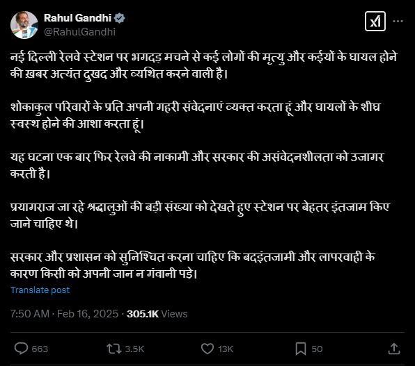 पार्टी के पूर्व अध्यक्ष राहुल गांधी ने कहा कि महाकुंभ के लिए प्रयागराज जाने वाले श्रद्धालुओं की बड़ी संख्या को देखते हुए स्टेशन पर बेहतर व्यवस्था की जानी चाहिए थी। गांधी ने ‘एक्स’ पर एक पोस्ट में कहा यह घटना एक बार फिर रेलवे की विफलता और सरकार की असंवेदनशीलता को उजागर करती है। प्रयागराज जाने वाले श्रद्धालुओं की बड़ी संख्या को देखते हुए स्टेशन पर बेहतर व्यवस्था की जानी चाहिए थी।