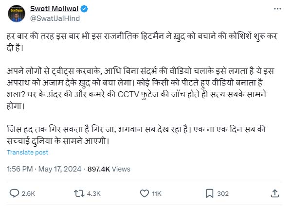 स्वाति मालीवाल ने एक्स पर लिखा है कि ‘हर बार की तरह इस बार भी इस राजनीतिक हिटमैन ने ख़ुद को बचाने की कोशिशें शुरू कर दी हैं। अपने लोगों से ट्वीट्स करवाके, आधी बिना संदर्भ की वीडियो चलाके इसे लगता है ये इस अपराध को अंजाम देके ख़ुद को बचा लेगा। कोई किसी को पीटते हुए वीडियो बनाता है भला? घर के अंदर की और कमरे की CCTV फ़ुटेज की जांच होते ही सत्य सबके सामने होगा। जिस हद तक गिर सकता है गिर जा, भगवान सब देख रहा है। एक ना एक दिन सब की सच्चाई दुनिया के सामने आएगी।’